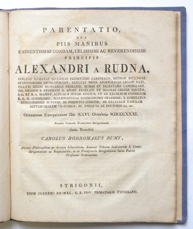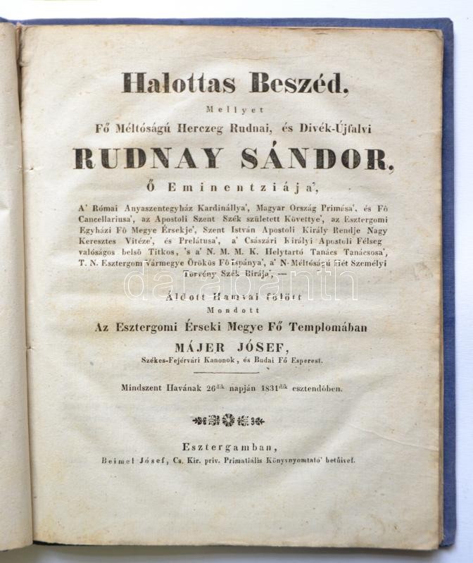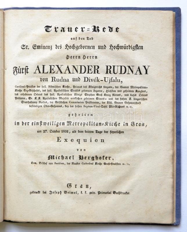 Oratio Funebris... Sacrae Romanae Ecclesiae Presbyteri Cardinalis Principis Alexandri a Rudna et Divék-Újfalu... die 25. Octobris 1831 Strigonii dixit Joannes Stankovits; Halottas Beszéd, Mellyet... Rudnay Sándor Ő Eminentziája... Hamvai fölött Mondott... Májer Jósef; Trauer-Rede... Herrn Herrn Fürst Alexander Rudnay... von Michael Berghofer; Parentatio... Alexandri A Rudna... Carolus Borromaeus Rumy. Esztergom (Gran, Strigonii), [1831], Jos. Beimel. Négy halotti beszéd Rudnay Sándor esztergomi érsek fölött, egybekötve, modern egészvászon kötésben