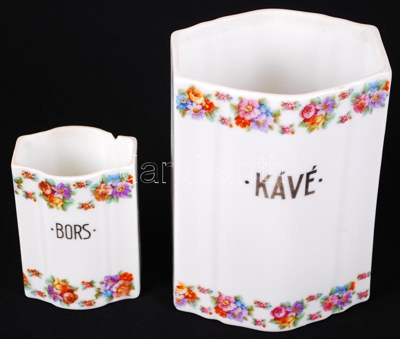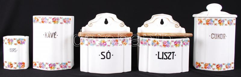 Háború előtti Zsolnay liszt-, cukor-, só-, bors-, kávé, edények, egyik sérült, matricások, jelzettek