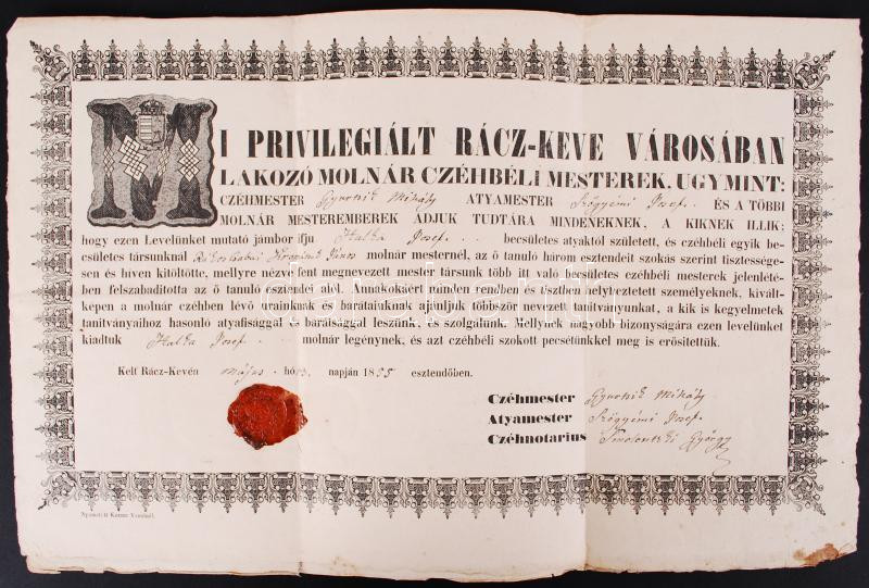 https://www.darabanth.com/en/190-Online-auction/190.0/Other-collectibles/Documents~800026/1855-Rackevei-lakkozo-molnar-ceh-kezzel-irt-mesterlevele-42x28-cm~II717834