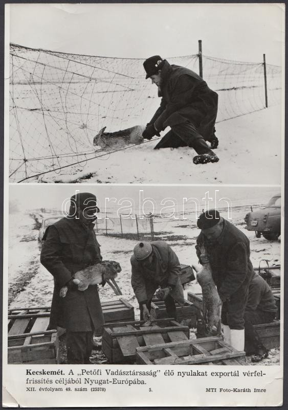 cca 1980 "Kecskemét. A 'Petőfi Vadásztársaság' élő nyulakat exportál vérfrissítés céljából Nyugat-Európába", sajtófotó, sérült, 26x18cm