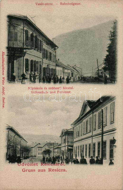 Resica, Vasút utca, Népiskola, Erdészeti hivatal / school, forestry of...