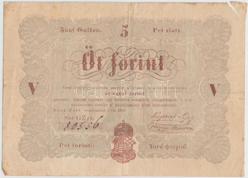 https://www.darabanth.com/en/191-Online-auction/191.0/Numismatics/Hungarian-Banknotes~200009/1848-5Ft-Kossuth-banko-barna-TIII-sarok-szakadas~II724793