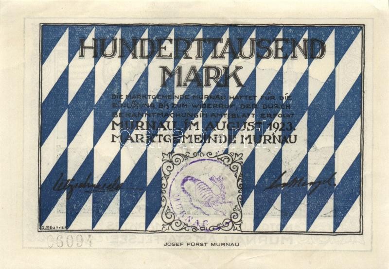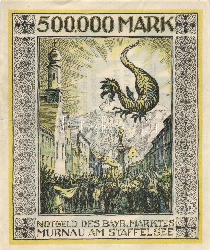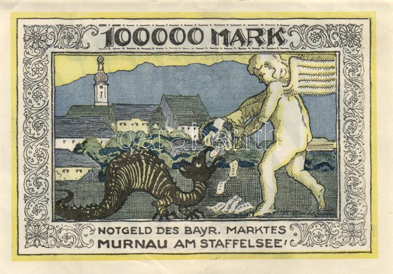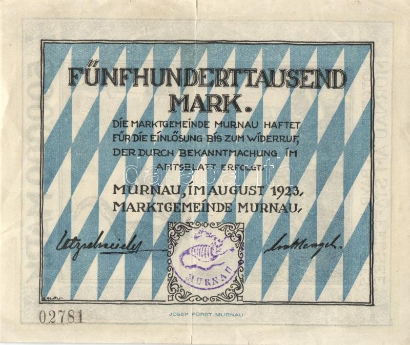 Német Birodalom / Weimari Köztársaság / Murnau am Staffelsee 1923. 100... https://www.darabanth.com/en/191-Online-auction/191.0/Numismatics/Hungarian-and-foreign-emergency-notes-and-coins-tokens~200008/Nemet-Birodalom-Weimari-Koztarsasag-Murnau-am-Staffelsee-1923-100000M-plus-500000M-TII-III~II721205
