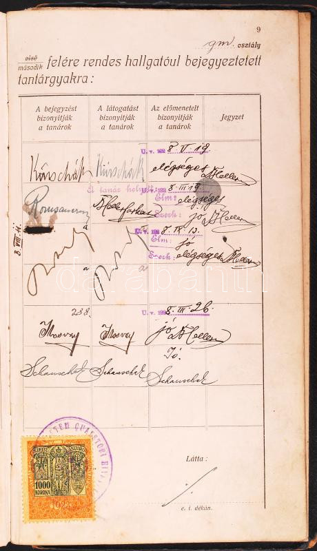 1926 Műegyetemi leckekönyv híres mérnök tanárok saját kezű aláírásával