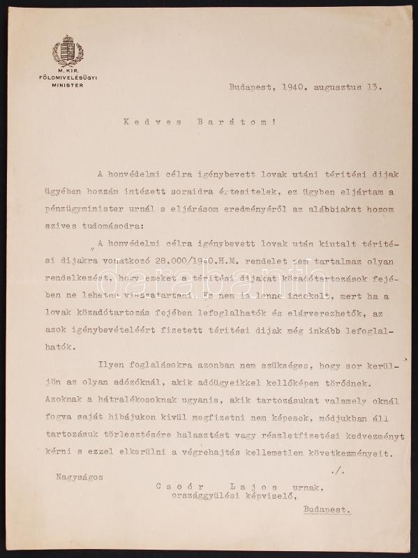 1940 Gróf Teleki Mihály, a Teleki-kormány földművelésügyi miniszterének aláírása hivatalos levélen