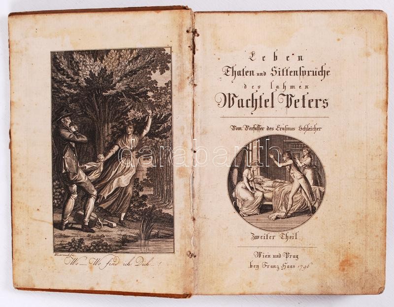 Description: [Cramer, Karl Gottlieb]: Leben Thaten und Sittensprüche des lahmen Wachtel Peters. Vom Verfasser des Erasmus Schleicher. Zweiter Theil. Wien und Prag, 1796, Franz Haas. Korabeli papírkötésben, rézmetszetű címképpel, a címlapon rézmetszetű vignettával (a kötés kissé viseltes) /