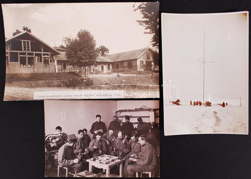 1914-1918 3kfl méretű katonai fénykép az I. világháborúból, feliratozva (rádióállomás Csernovitznál, cipészműhely, katona otthon építése)