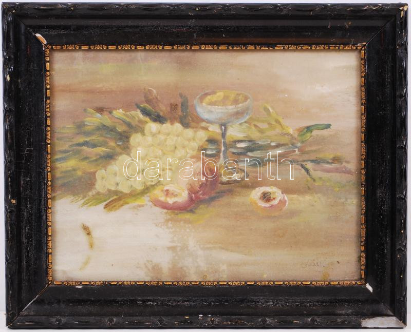 Orbán jelzéssel: Szőlős csendélet. Olaj, vászon, sérült, antik üvegeze...