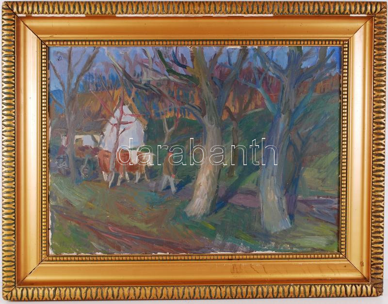 Thuróczy Zoltán (1935-): Falusi jelenet. Olaj, vászon, antik sérült keretben, 50×70 cm