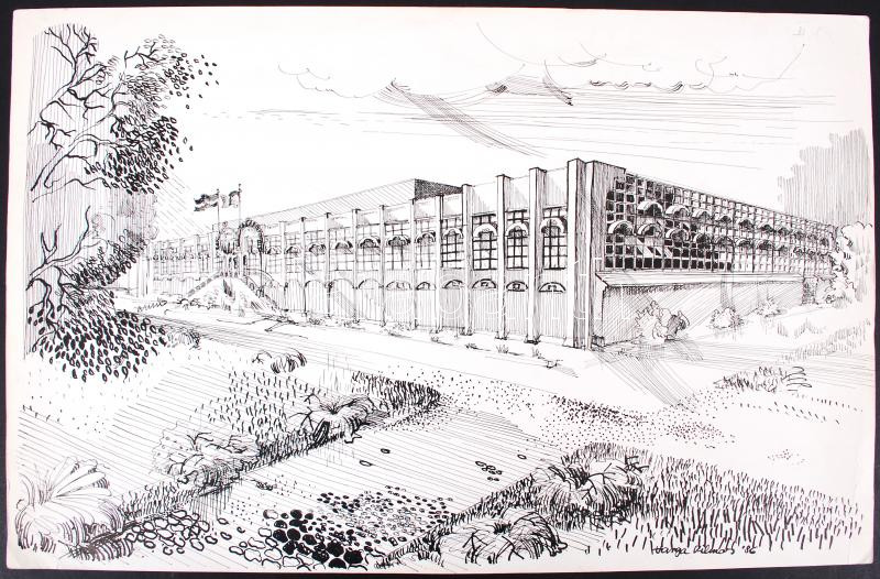 Varga Miklós: Petőfi Csarnok új épülete 1986. Tus, papír, jelzett, 32×...