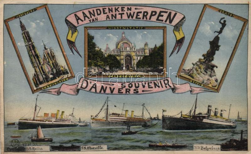 Antwerpen cathedral, middle station, Brabo, SS Melila, SS Albertville, SS Belgenland (EK)