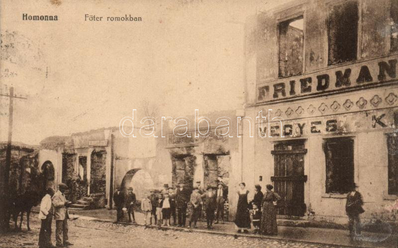 Description: Homonna, Humenné; Fő tér romokban, Berkovits József üzlete, Friedman vegyeskereskedése, Hossza Gyula kiadása / destroyed main square, shops, grocery store (Rb)