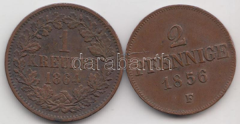Német Államok / Szász-Albertine 1856F 2Pf Cu + Baden/ 1864. 1Kr Cu T:2... https://www.darabanth.com/en/192-Online-auction/192.0/Numismatics/Foreign-coins~200014/Nemet-Allamok-Szasz-Albertine-1856F-2Pf-Cu-plus-Baden-1864-1Kr-Cu-T2-3Cbr3EGerman-States-Saxon~II728404