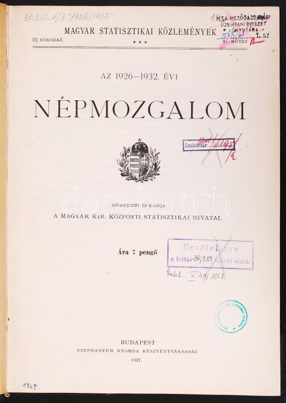 Magyar Statisztikai Közlemények: Népmozgalom 1926-1932 Bp., 1937 Athen...
