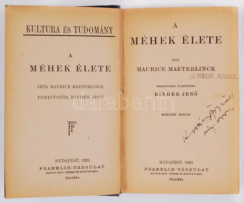 https://www.darabanth.com/en/192-Online-auction/192.0/Other-collectibles/Books-Other-rarities~2000038/Maurice-Maeterlinck-A-mehek-elete-Budapest-1923-Franklin~II726470