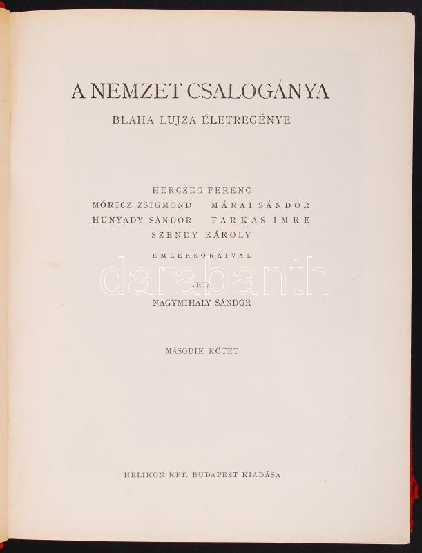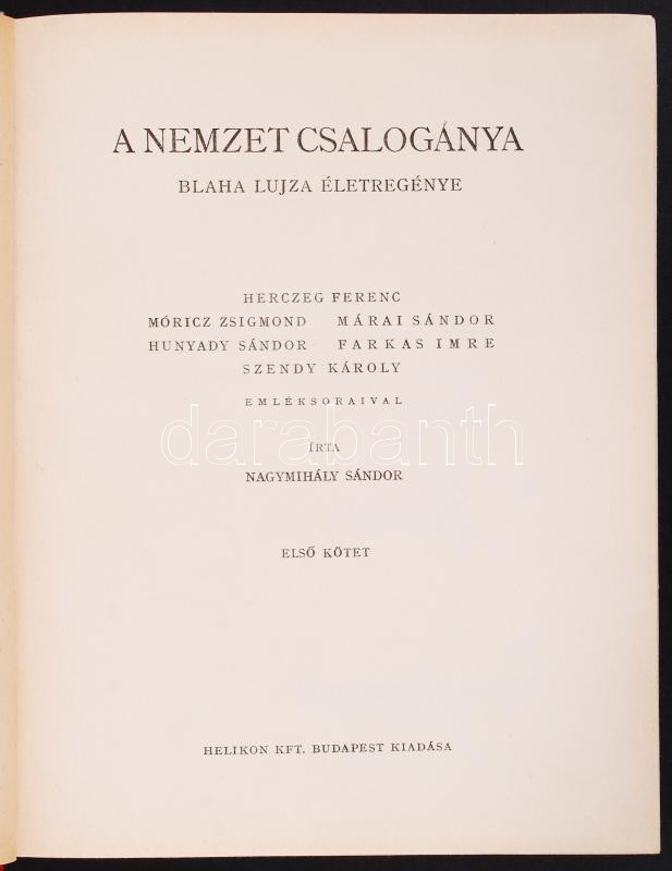 Nagymihály Sándor: A nemzet csalogánya. Blaha Lujza életregénye I-II. Herczeg Ferenc, Móricz Zsigmond, Márai Sándor, Hunyady Sándor, Farkas Imre és Szendy Károly emléksoraival. Bp., (1926) Helikon. Kiadói, népies motívumokkal díszített, egészvászon kötésben, gazdagon illusztrálva, jó állapotú
