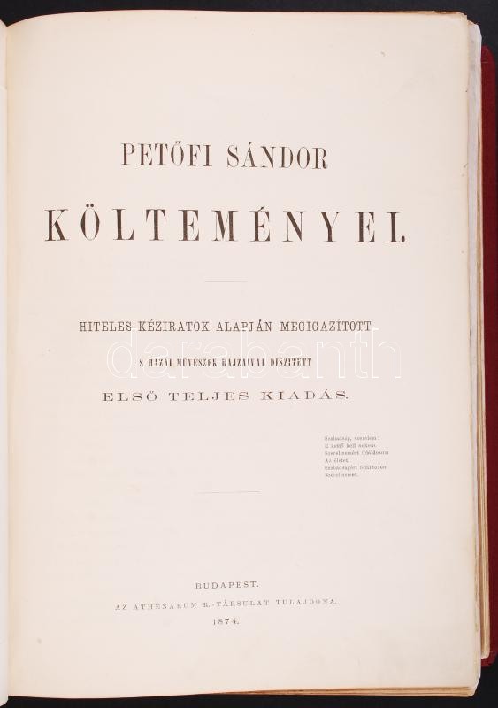 Petőfi Sándor költeményei. Hiteles kéziratok alapján megigazított s ha... https://www.darabanth.com/en/192-Online-auction/192.0/Other-collectibles/Books-Other-rarities~2000038/Petofi-Sandor-koltemenyei-Hiteles-keziratok-alapjan-megigazitott-s-hazai-muveszek-rajzaiva~II731575