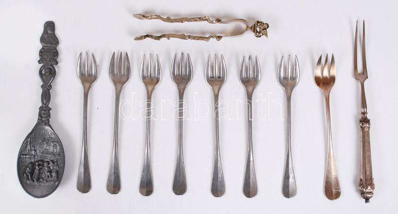 Evőeszközök: 8db süteményes villa, cukortartó, egy ón díszkanál és egy ezüstözött nyelű húsvilla /