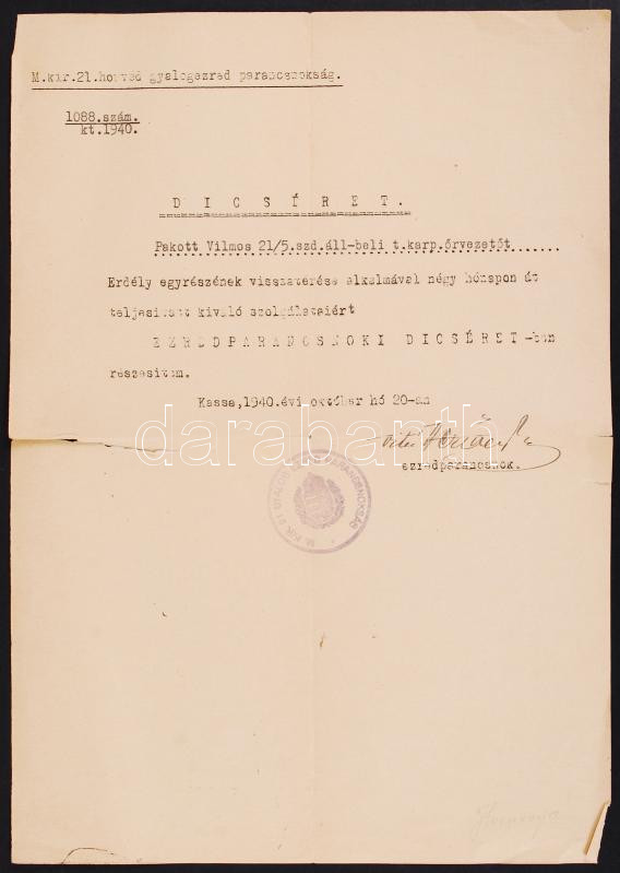 https://www.darabanth.com/en/192-Online-auction/192.0/Other-collectibles/Military~2000017/1940-Kassa-ezredparancsnoki-dicseret-M-Kir-21-Gyalog-Ezred-Parancsnoksag-pecsettel~II730412