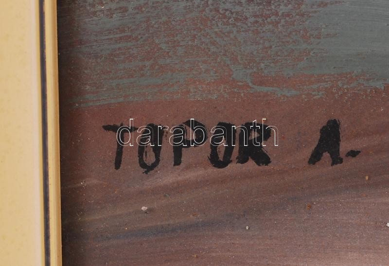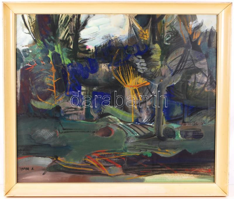 Topor András (1944-1997): Őszi erdő. Olaj, farost, jelzett, üvegezett keretben, 60×80 cm