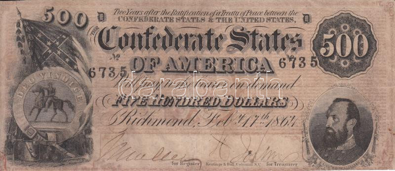 Amerikai Konföderációs Államok / Richmond 1864. február 17. 500$ T:III... https://www.darabanth.com/en/193-Online-auction/193.0/Numismatics/Foreign-banknotes~11/Amerikai-Konfoderacios-Allamok-Richmond-1864-februar-17-500USD-TIIIrestauralt-3Cbr3EConfed~II735719