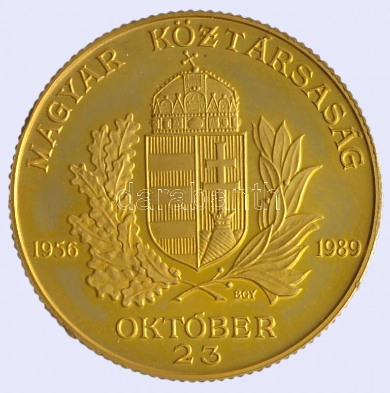 1989. "Magyar Köztársaság Emlékérem" Au emlékérem (9.4g/0.98... https://www.darabanth.com/en/193-Online-auction/193.0/Numismatics/Hungarian-and-foreign-gold-coins~10/1989-Magyar-Koztarsasag-Emlekerem-Au-emlekerem-94g098623mm-szigno-Bognar-Gyorgy~II705183