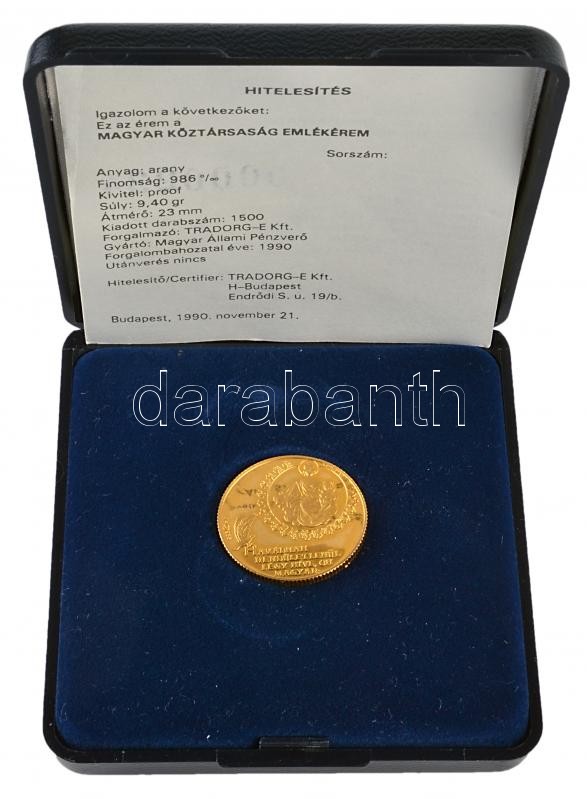 Description: 1989. "Magyar Köztársaság Emlékérem" Au emlékérem (9.4g/0.986/23mm), szignó: Bognár György; eredeti dísztokban tanúsítvánnyal T:PP Csak 1500db!