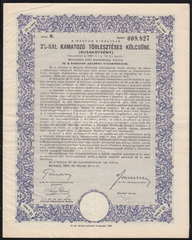 1944. A Magyar Királyság 3%-kal kamatozó törlesztéses kölcsönének 10q / 400P-ős búzakötvénye