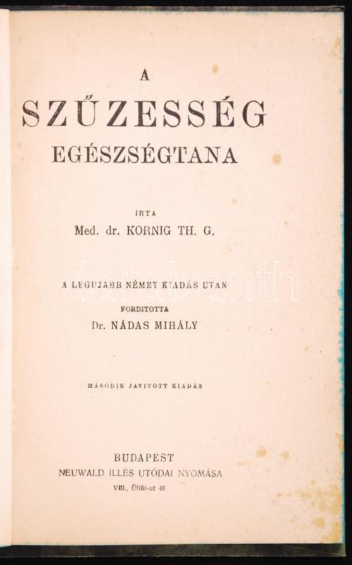 Med. dr. Kornig TH. G.: A szüzesség egészségtana. A legújabb német kiadás után ford.: Dr. Nádas Mihály. 2. JavÃtott kiadás, é.n., Budapest, Neuwald Illés utódai nyomása, félvászon kötésben