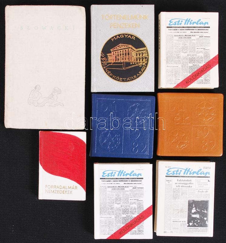 8db minikönyv, 3db Esti Hírlap különkiadás, Juliusz SŁowacki: Poeci Polscy. Czytelnik, 1961. k.n., 2db 1982-es új évi verseskönyv, Gedai István: Történelmünk Pénzeken. Bp., 1975. k.n. Végh Ószkár: Forradalmár nemzedékek. Ifjúsági lapkiadó vállalat, 1978.