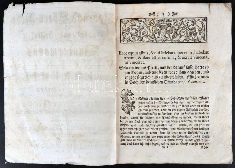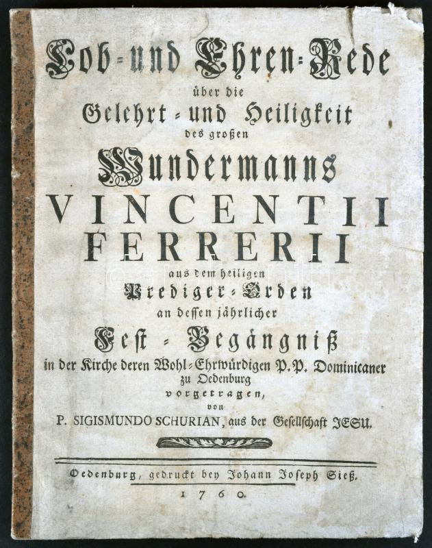 Description: Lob- und Ehren-Rede über die Gelehrt und Heiligkeit des großen Wundermanns Vincentii Ferrerii [Ferreri Szent Vince]... von P. Sigismundo Schuian aus der Gesellschaft Jesu. Oedenburg (Sopron), 1760, (gedruckt bey Johann Joseph Sieß, 29p.