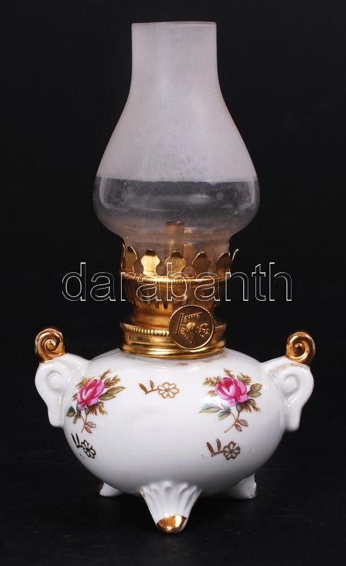 Virágmintás, aranyozott porcelán olajlámpácska burával /