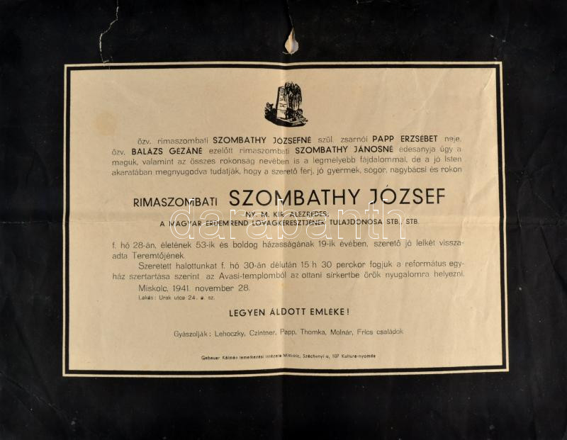 1941 Rimaszombati Szombathy József ny. m. kir. alezredes gyászjelentés...