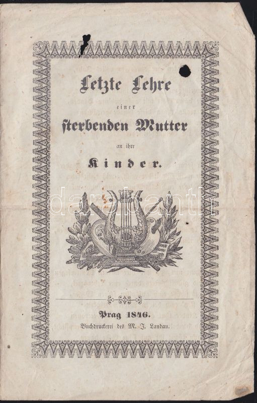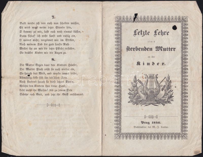 1846 A haldokló anya utolsó tanítása gyermekének. Német vers, Prága, Landau nyomda 4 oldal ()egy kis lyuk