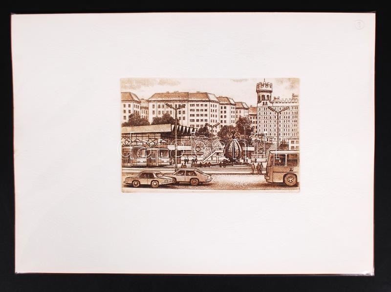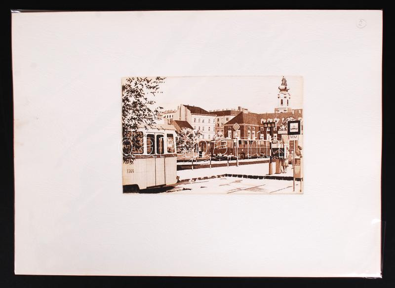 19 db kis méretű jelzés nélküli rézkarc a BKV járműveiről, 9×14 cm