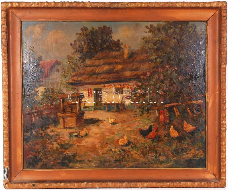 Olvashatatlan jelzéssel: Tyúkudvar. Olaj, karton, antik keretben 66×80...