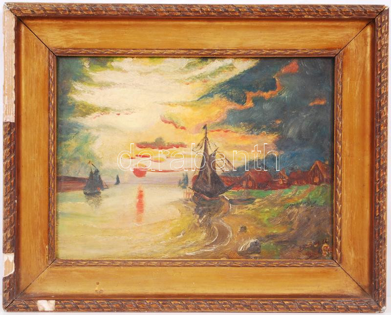 Szabó Mátyás: Vitorlás napnyugtában. Olaj, karton, jelzett, antik kere...