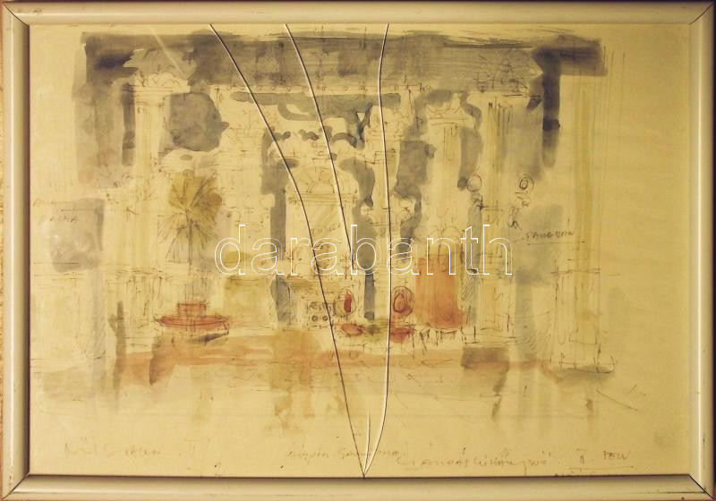 Székely László (1932-): Díszletterv (A Csárdás királynőhöz), egyedi tus-papír, keretben 31x22 cm (üveg törött)