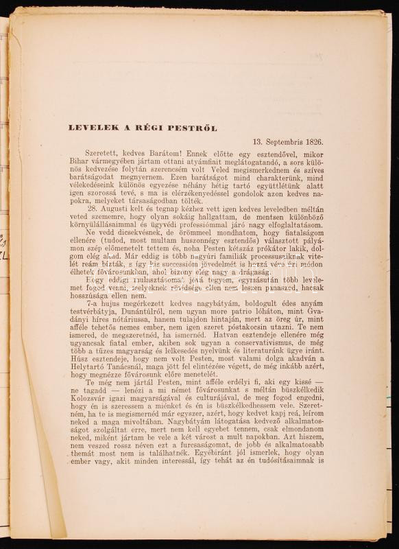 1826 Színnyei Fenec: Levelek a régi Pestről in Napkelet 1923-8,9,10-1924-2. 26 oldalas töredéke