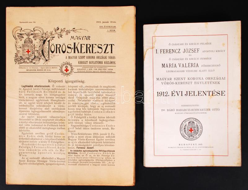 1910 és 1918 Magyar Szent Korona Országai Vörös-Kereszt Egyenletének 1912. évi jelentése, foltos + 1918. Magyar Vörös-Kereszt újság