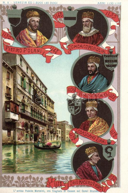 Doges of Venice from 1130 to 1192; Pietro Polani, Domenico Morosini, Vitale Michiel II, Sebastiano Ziani, Orio Mastro Pietro, litho