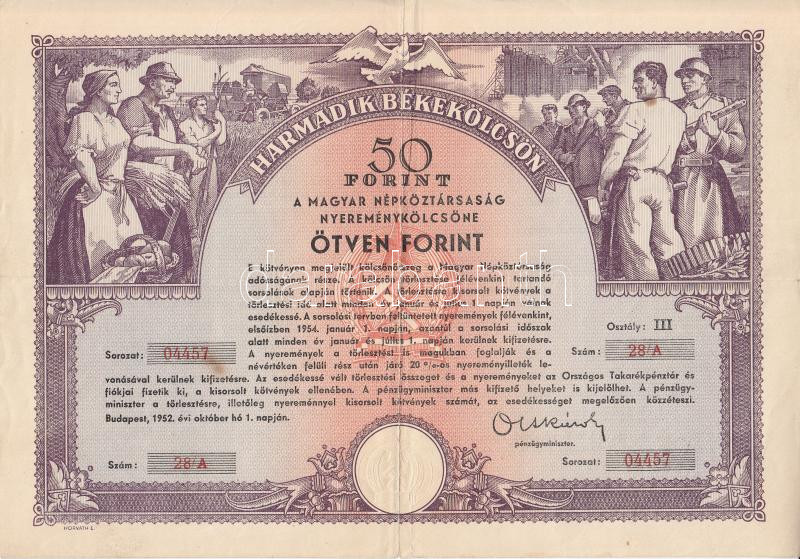1952. "Harmadik Békekölcsön" nyereménykölcsön 50Ft-ról T:III(kis besza...