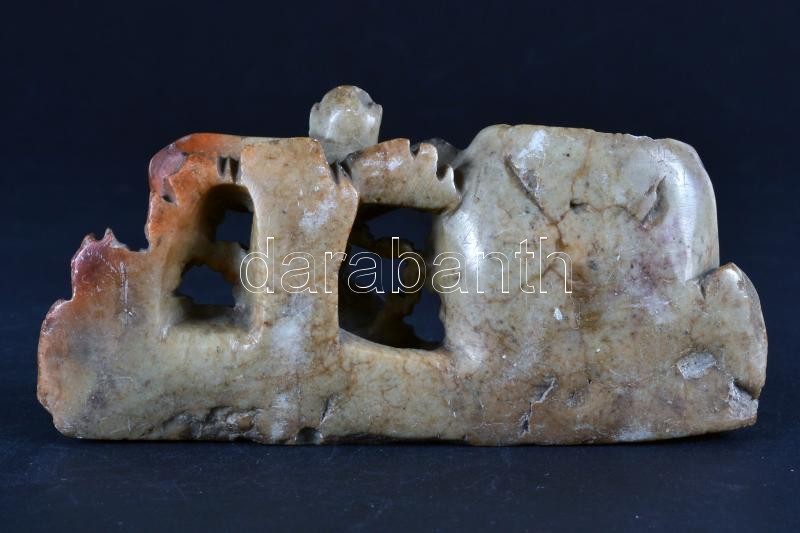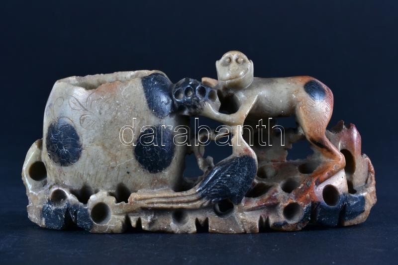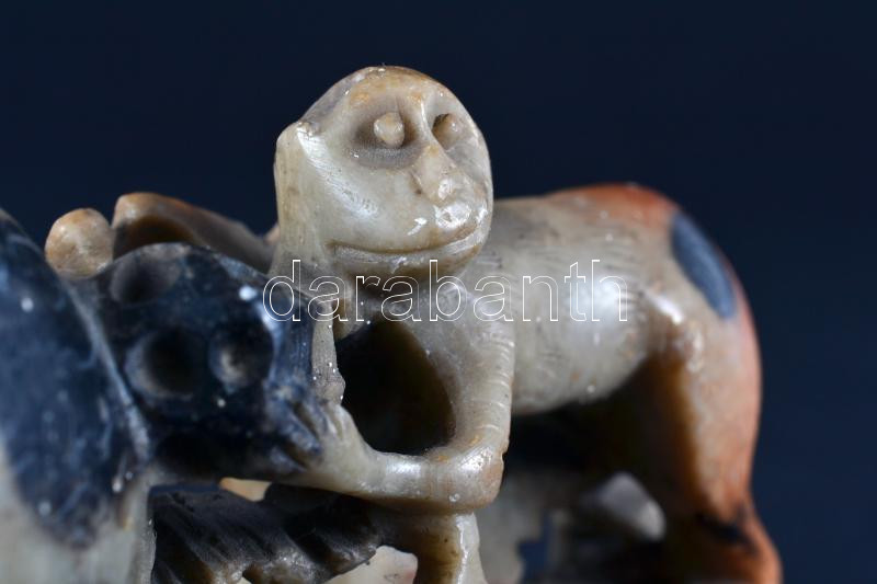 Majom az elejtett madárral. Faragott zsírkő, sérült, h:13 cm