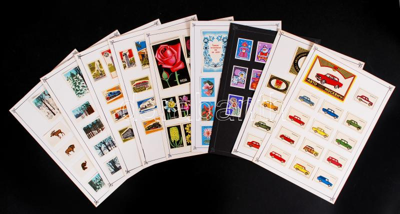 143 db szovjet gyufacímke kartonokra felragasztva komplett motívum sorozatok virág, állat, autó, épületek