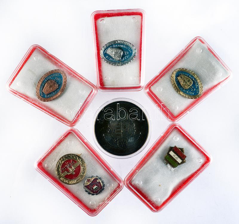 Description: 6db szocialista kitüntetés tokban: "MÁV Szolgálatáért" 10,20, 30 év után, "A Szakma Ifjú Mestere", "Kiváló Szocialista Brigád", "Szocialista Brigád" + 1996. "Magyar Vasút - 150 éve Európában - Pest-Buda" fém emlékérem T:2