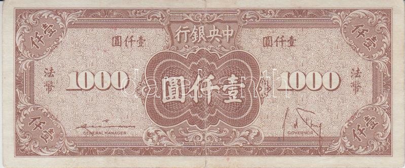 China 1945. 1000 Yuan + 1999....