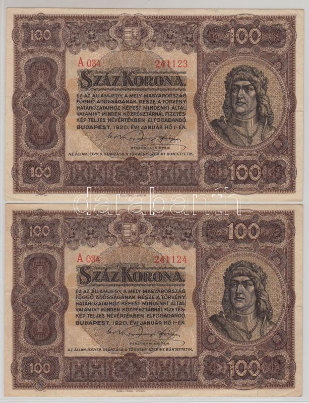 https://www.darabanth.com/en/195-Online-auction/195.0/Numismatics/Hungarian-Banknotes~400009/1920-100K-2x-egymasutani-sorszammal-TII-sarokhajlas~II748274