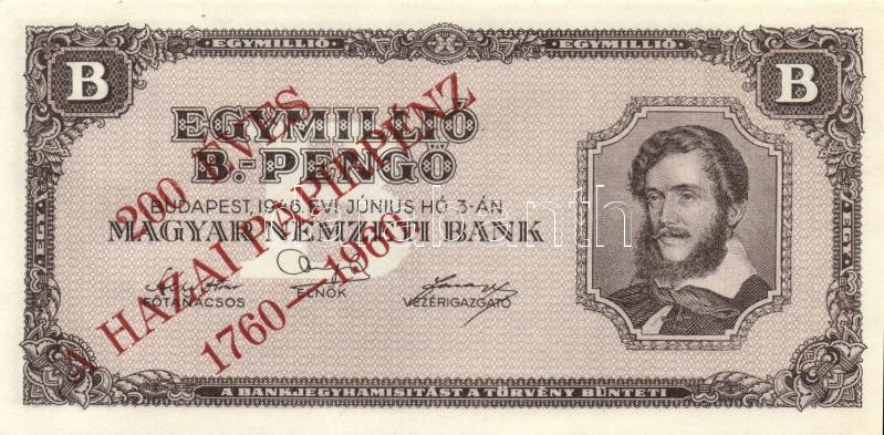 Description: 1930. 100P "10 éves a Magyar Éremgyűjtők Egyesülete 1969-1979" felülbélyegzéssel + 1946. 100.000.000P + 1946. 1.000.000MP (2x) színváltozatok, egyik "MINTA" perforációval, "200 éves a hazai papírpénz 1760-1960." felülbélyegzéssel + 1.000.000BP (2x) színváltozatok, "200 éves a hazai papírpénz 1760-1960." felülbélyegzéssel! T:I-III