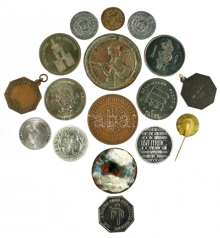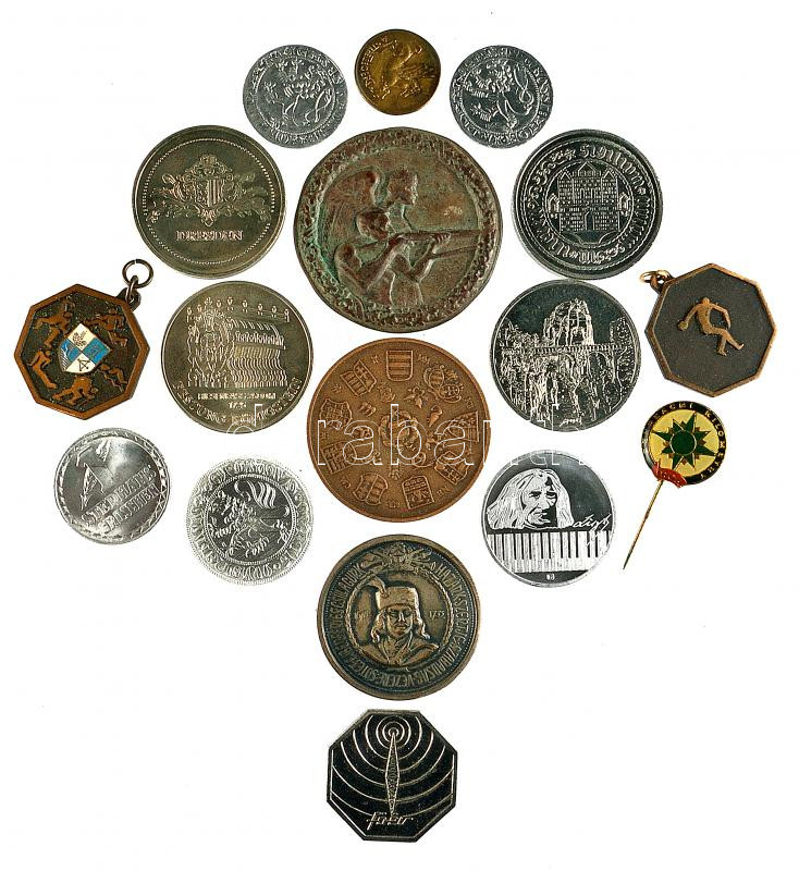 Description: 17db vegyes magyar és külföldi emlékérem és kitűző, közte "Festung Königstein", "1969-1979 Magyar Éremgyűjtők Egyesülete" , 1974. "Magyar Rádió Futó-Kocogó Versenye" fém emlékérmek T:vegyes