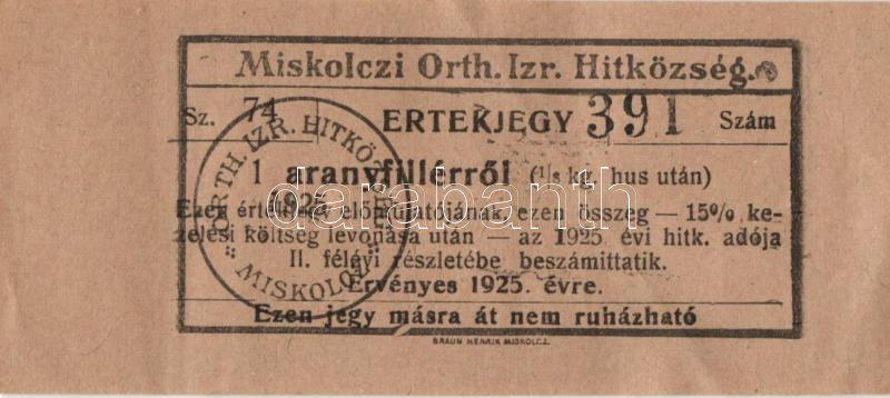 1925. Miskolczi Orth. Izr. Hitközség értékjegye 1 aranyfillérről T:II